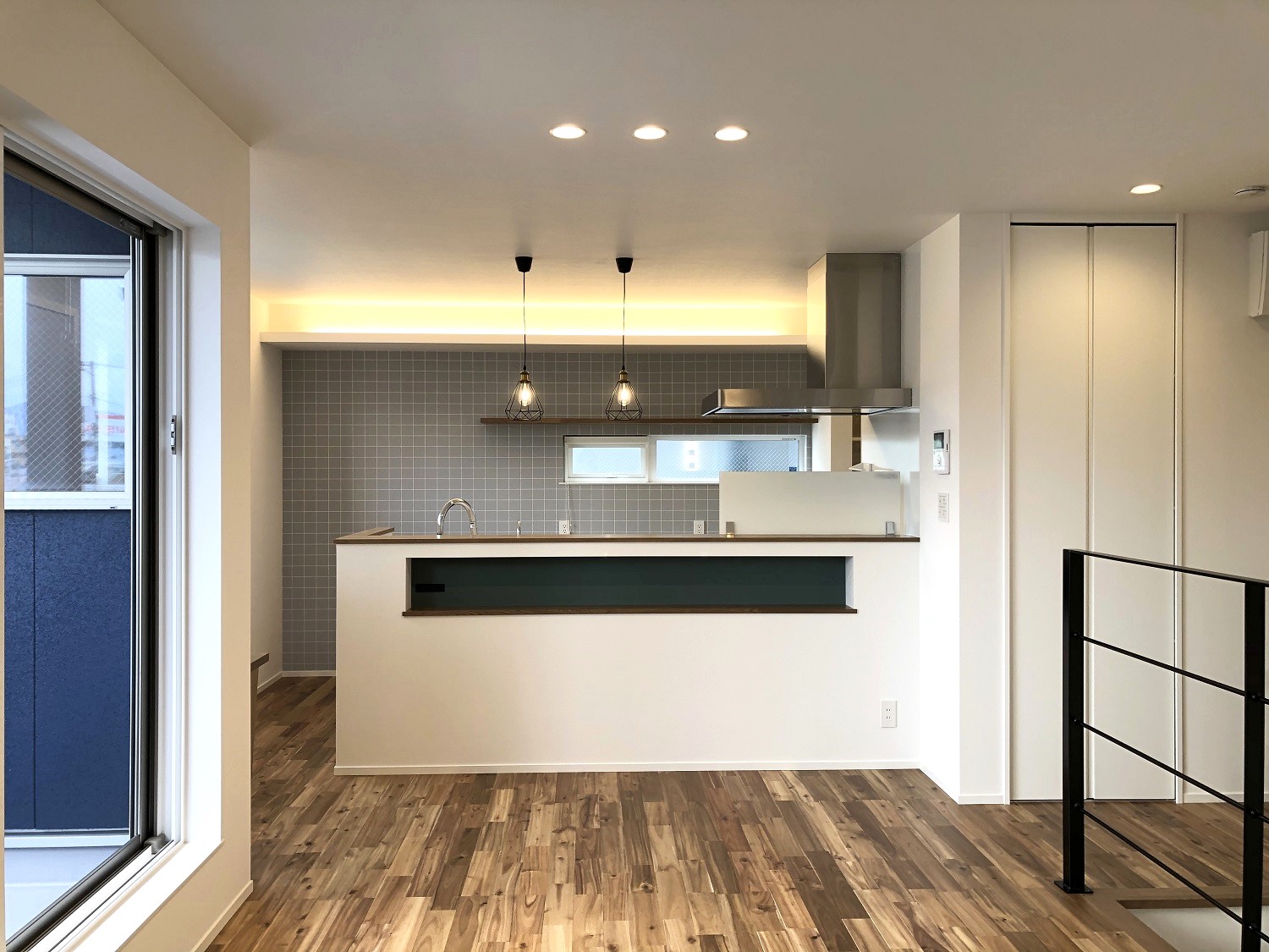 キッチンの奥は水廻りスペースとファミリークローゼットを配置し忙しい朝もワンフロアで問題解決