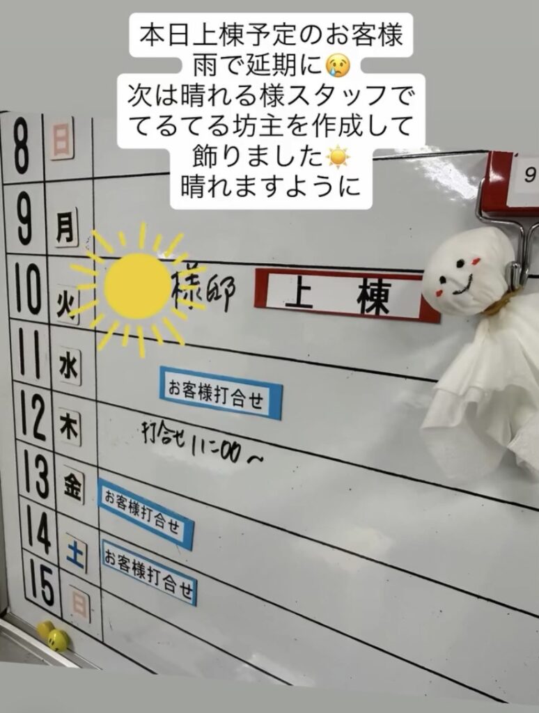 実は当初予定していた上棟日は、あいにくの雨予報…。
