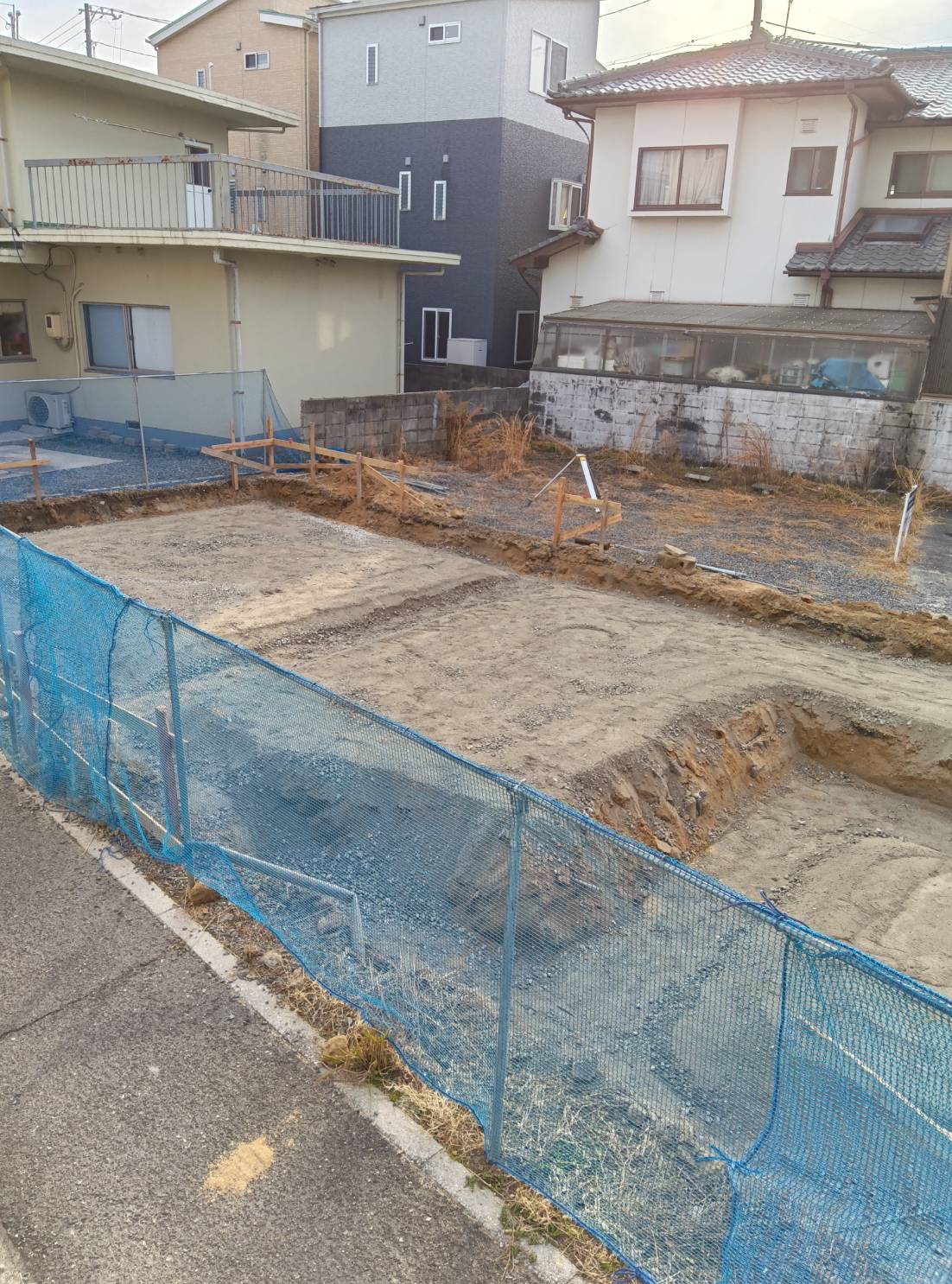 着工前に地盤の確認を行い、丁張り・掘削作業が終わり、配筋工事、コンクリート打設へと作業が進んでおります。