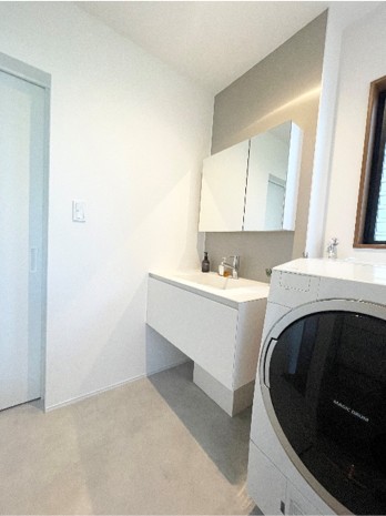 リビングの雰囲気に合わせ和室は和紙畳の縁無し畳に変更。洗面台や玄関収納はデザインがシンプルなサンワカンパニー製品を採用し、ミニマルでノイズレスな空間に仕上げました。